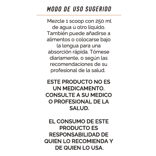 Tomar entre 1 a 3 g diarios, disueltos en agua o bebida de elección, preferentemente en ayunas o antes de dormir.